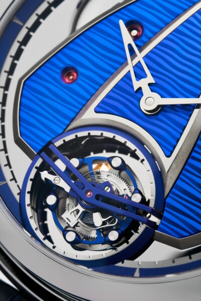 Barrel bridge cover and triangular central bridge in blued grade 5 titanium with random guilloché and drawn chamfered contours