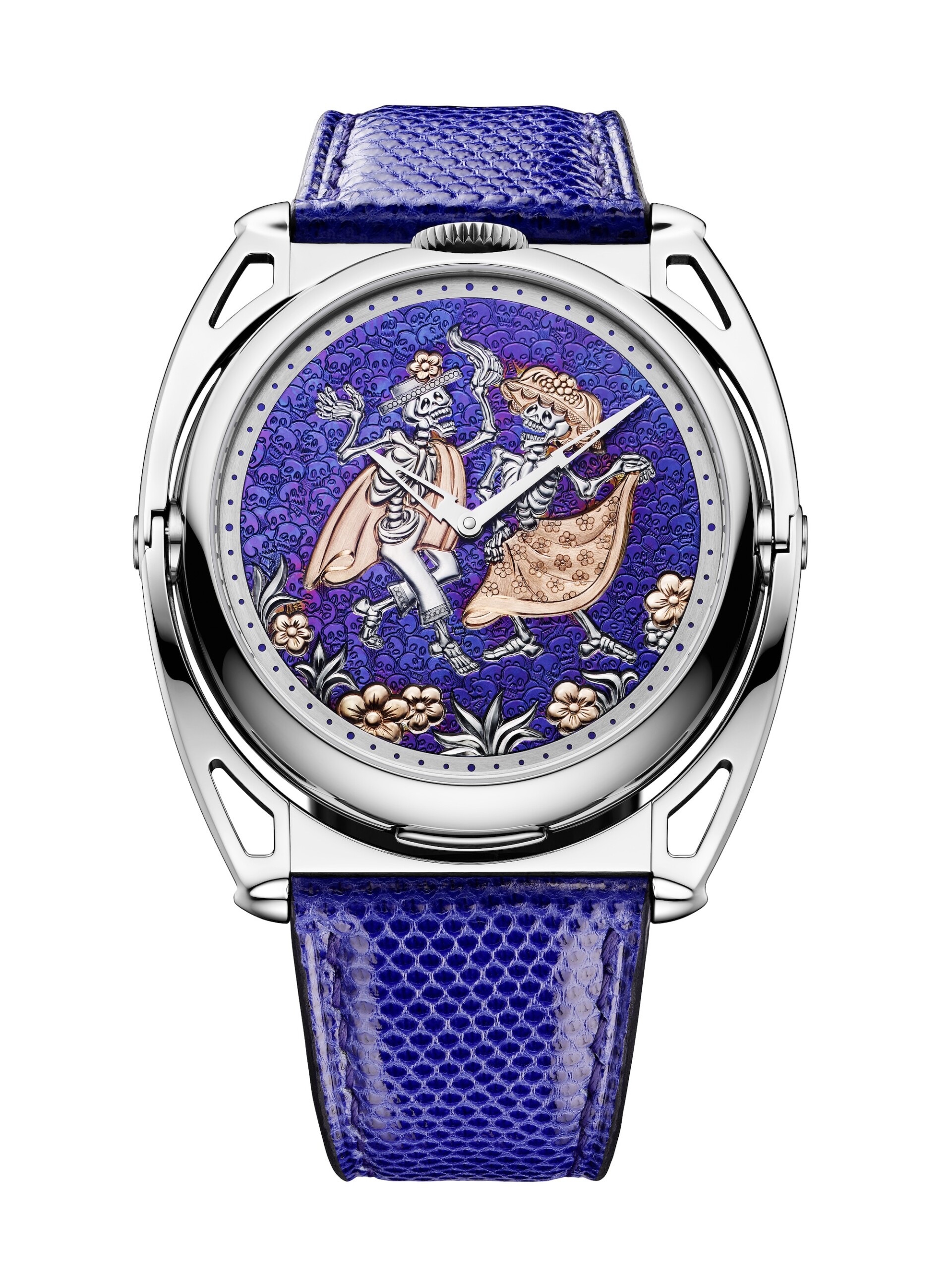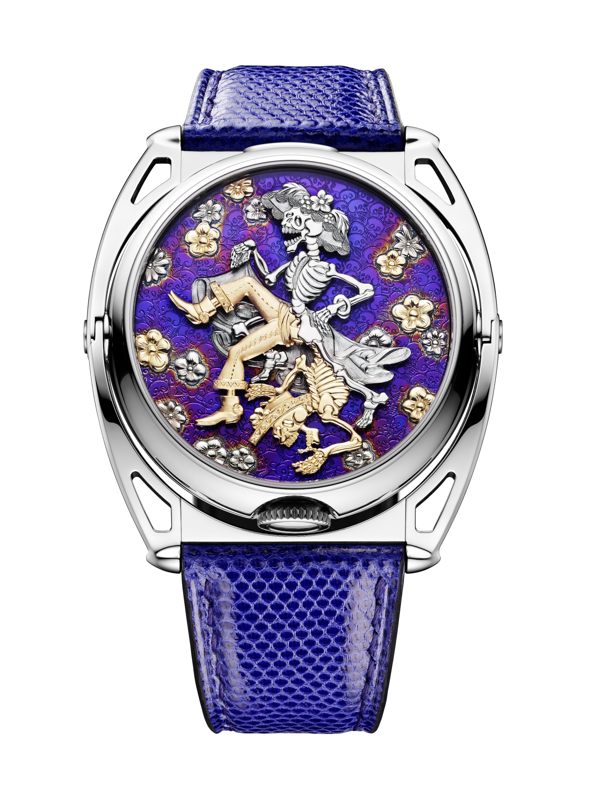 On the occasion of Mexico’s SIAR watch show, De Bethune presents the “Cempasúchil II”, a new one-of-a-kind creation in its Maestri’art collection. Twin sides! Two dials, two faces, two identities… Hovering between life and death, with a touch of naughty humour, just like the joyous and colourful Mexican Dia de Muertos celebration! For Mexico, De Bethune is once again having fun in celebrating the Day of the Dead (Dia de Muertos). Denis Flageollet makes no secret of the fact that since the release of the Kind-of-Two in 2020, he has revelled in surprising people with the multiple possibilities afforded by such a double-sided watch and is looking forward to receiving collectors’ requests for one-of-a-kind timepieces in order to play with these countless options! To kick off this future festival of made-to-order Kind-of-Two watches, what more fun could Denis Flageollet have than getting down to work with his long-time accomplice – Swiss Art engraver Michèle Rothen – in order to demonstrate the watch’s full potential. Midway between engraving and micro-sculpture, Michèle’s engraving surpasses all existing standards. Her infinitely accurate work is backed by Swiss artistic talent recognised as among the very best. A joyful and naughty depiction of death For the “Cempasúchil II” reflecting a hint of mischief (and a touch of naughtiness!), they have jointly revived the characters featured in the DW5 Cempasúchil (presented in Mexico in 2020), this time by choosing the double-sided Kind-of-Two watch. Its first dial is transformed into a dance floor for two Calaveras, indicating the hours and minutes. On the other side of the watch, a dedicated decor (usually hidden behind a secret cover) features a naughty depiction of our two Calaveras ‘in action’. Beneath a show of laughing ossuaries worthy of La Catrina, an array of cams, levers and are set into motion and bring the two characters to life as a surprising and fun treat for amused observers. Animated on demand by a highly complex mechanism (like a small automaton) by means of a button at 12 o’clock, the merry scene conveys a sense of gaiety and mischief… An even closer look reveals a little humorous touch from the two designers as it’s the “girl” taking the lead in this traditional Kamasutra position. The entire engraving work on both dial sides is a nod to the brilliant Mexican engraver José Guadalupe Posada, an artist who made the dead dance in the late 19th century and already inspired Denis Flageollet and Michèle Rothen in 2020 when designing the DW5 Cempasúchil. With this new creation, they have once again picked the aesthetic codes and details of the work down by Posada, who has gained lasting renown for his genius in turning macabre art on its head and aligning it with the singular way Mexicans joyfully celebrate their dear departed. The titanium casing has been flame-blued and engraved with subtle gold inlays to bring light and a discreetly precious touch. This one-of-a-kind creation thus perfectly demonstrates the versatile nature of the Kind-of-Two, which offers clients the possibility of ordering bespoke versions with their very own automaton mechanism, giving free rein to their imagination. This provides scope for all kinds of animations, including non-erotic ones, as well as different movement configurations. The beauty of this double-sided artwork thus reflects both mechanical and aesthetic perfection.