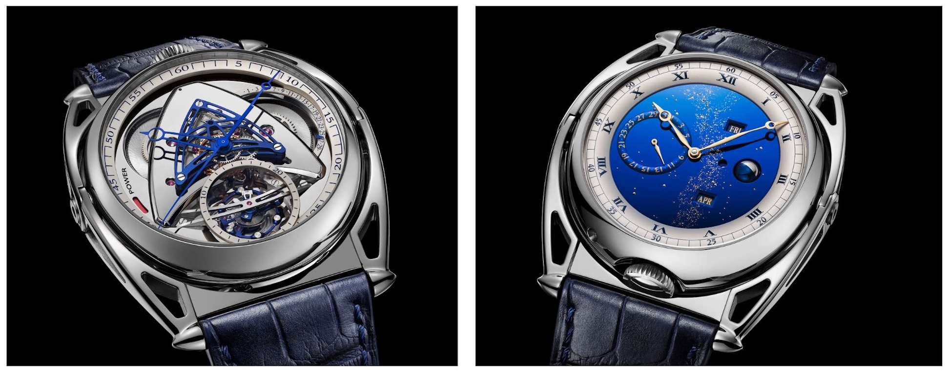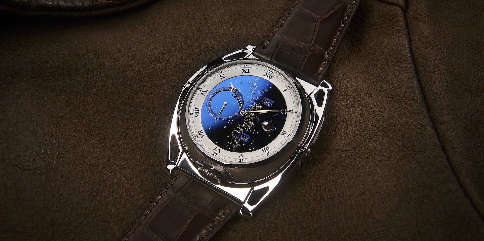 Representing the quintessence of De Bethune-style Haute Horlogerie, the DB Kind of Grande Complication is a veritable compendium of the core technical and aesthetic attributes that have been invented and built up over 22 years of innovation, research and creativity within the Manufacture. Encapsulating the memory and culture of De Bethune in an exceptional timepiece that illustrates the technical and artistic expertise and excellence cultivated in its L’Auberson workshops was the challenge taken up by Denis Flageollet and his high-flying team. The DB Kind of Grande Complication is the culmination of a young watchmaker’s dream, as he gazed in wonder at double-sided grand complication models and already anticipated creating such a timepiece. After many years of design and development at De Bethune, Denis Flageollet has at last brought it to life by drawing on all the resources and philosophy of the Manufacture, which perpetuates the innovative spirit of the great classical watchmaking achievements characterising the Age of Enlightenment. DB Kind of Grande Complication, a compendium of De Bethune techniques and innovation The choice of a reversible double-sided case was entirely natural, since it not only unites a large number of complications, but also alloys provides scope for free-spirited aesthetic expression through the dual display of the various functions. The case is also interesting in that it incorporates a rotation system (a novel feature introduced in 2021) mounted on floating lugs which – by means of an ingenious micro-mechanism – enable the case to pivot around its central axis in a smooth, accurate swivelling movement. More than 60 components – 50 of which relate to the water-resistant part and are therefore perfectly rustproof – are involved in positioning the dial on either side. A cam-operated indexing system ensures perfect alignment of the case with the floating lugs that follow the curves of the wrist. The rounded design of its classically inspired case with its crown at 12 o’clock on the contemporary side (6 o’clock on the traditional side) conceals the technical challenges of a double case complexified by a multiple display of several functions and the combination within a single calibre of eight different horological complications: perpetual calendar, spherical moon-phase indication, retrograde age of the Moon and leap years, ultra-light tourbillon in blued titanium, jumping seconds, power reserve as well as the double display of hours and minutes. Integrating each of the 751 components involved in its exterior and movement required much more thought than assembling the various complications separately. Rethinking the calibre as a functional whole so that each complication interacts in perfect harmony is a technical feat that would be inconceivable without total technical mastery of all the innovations and patents involved in the Manufacture’s 32 calibres. DB Kind of Grande Complication, reaffirming a powerful contemporary aesthetic A contemporary side displays the refined structure of Calibre DB2529, the end of the power reserve and the age of the Moon by means of a retrograde silver-toned indicator that facilitates accurate updating of the lunar day. It highlights the contrast between the hectic 36,000 vph pace of the De Bethune 30″ tourbillon – one of the fastest and lightest on the market – and the ample, subdued beat of the slender mirror-polished steel hand marking off the seconds. This contrast is orchestrated at 6 o’clock by 63 components – essentially made of titanium and weighing a total of just 0.18 g (the lightest of them weighs less than 0.0001 grams and the heaviest 0.0276 g) – and by a central jumping seconds mechanism composed of two gold wheels driven by a double pallet-lever with four pallets, setting a noble cadence for the passing of time. An aesthetic symbol of the brand, the mirror-polished deltoid bridge supports the asymmetry of the gear trains featuring subtle decorations pushed to extremes on even the slimmest components. Each one, through its function and finishing, contributes to the calibre’s understated aesthetic and technical silence. Another classically restrained side features a dial with a perpetual calendar enhanced by a three-dimensional moon-phase display as well as by the Manufacture’s signature starry sky. Light is resolutely at the heart of the Maison’s creative process and reflected here in the blued mirror-polished titanium of the dial, revealing through multiple shimmering effects the different tones endowing the De Bethune Blue with its unique character. The hand-decorated sky is hand-fitted with small white gold pins depicting the stars and adorned with Milky Way patterns produced by laser-beam micro-milling and gilded with 24-carat gold leaf. Much like our observation of the sky, the moon phases can be read off at 3 o’clock by means of a homogeneous sphere spinning on its axis and composed of two perfectly balanced half-spheres in flame-blued steel and mirror-polished palladium. The reproduction of the different movements of this heavenly body is supported by a high-precision mechanism that takes a full 112 years to accumulate a one-day deviation. Faced with the volume required by such a sphere within the limited space of the watch, the technical solution introduced in 2004 was to gently bend the hands downwards to ensure they could glide smoothly over the Moon, a curved shape that would become one of the brand’s typical distinctive features. Like the leap-year indicator aligned at 3 o’clock, the subtle play of superimposed blues in the counter rings and apertures, along with the gilded juxtaposition of the day, month and date displays, blend seamlessly into the sky and the Milky Way without ever losing their legibility. The extremely fine opaline silvering of the hours and minutes ring, the soft lines borrowed from the hunter-type case, the graphic design of the numerals, the sty