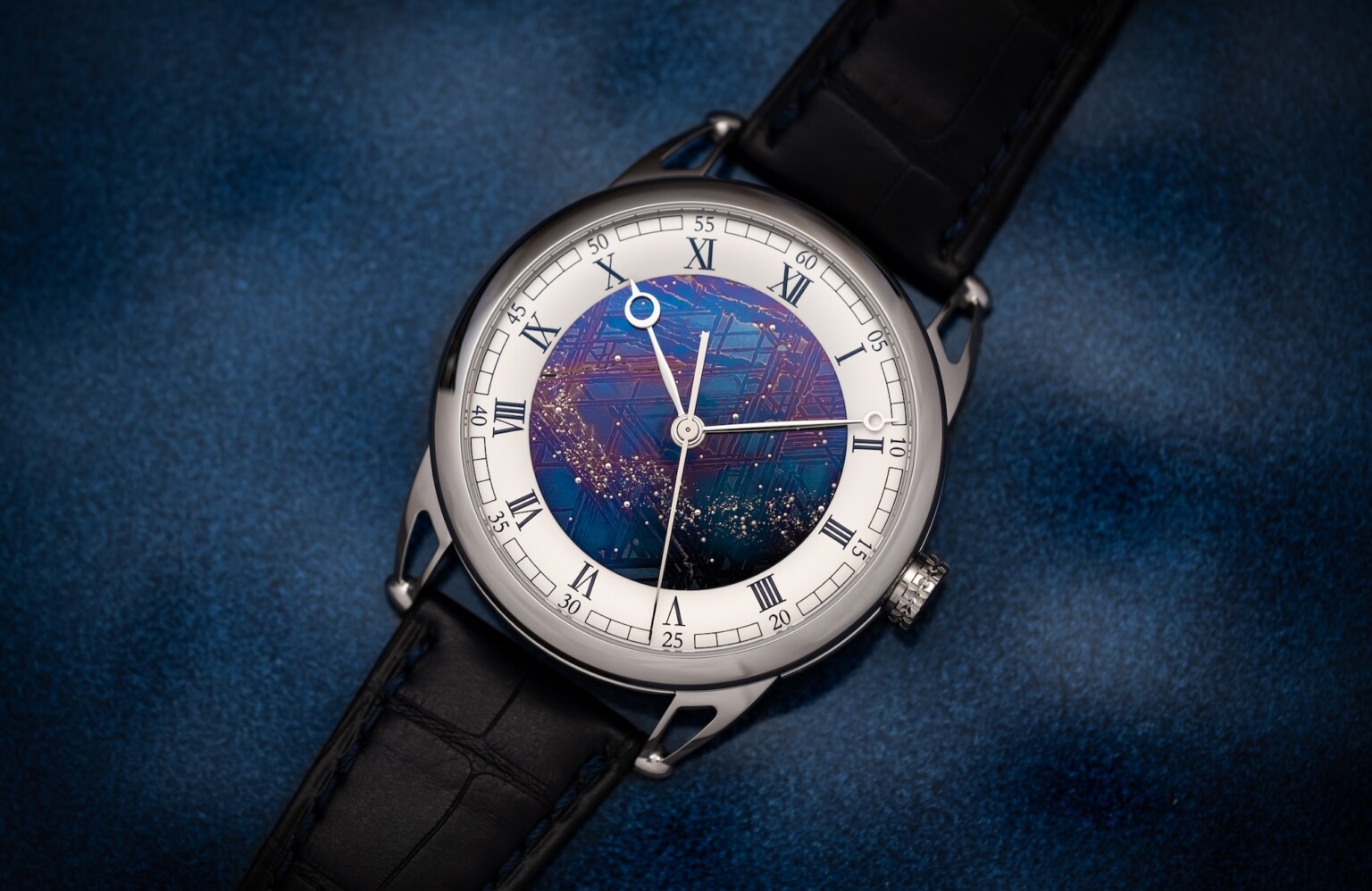 And it is in the very heart of stars, where our thermometer would show a few million degrees, that iron meteorites are born. This powerful and poetic energy then gives birth to a new star, or even a galaxy. Created from a meteorite, the DB25 Starry Varius Aérolite becomes the witness to this chaotically orchestrated force. De Bethune has enriched its dial with a starry sky emblematic of this timeless material. Thus, a moment is engraved where time has ceased to exist. “The cosmos, time, the sky… when you want to see time evolve and you have no instruments, you observe the sky. This is one of the recurring themes in watchmaking,” explains Denis Flageollet, Master Watchmaker and creator of De Bethune. Constantly in search of innovation, it is in the diversity and simplicity of nature that De Bethune carves its most beautiful creations. The DB25 Starry Varius Aérolite will be limited to a production of five pieces per year. Beauty from above and beyond Ferrous meteorites have already been used at De Bethune, notably to create one of the cases of the famous Dream Watch 5, the dial of the DB28 Kind of Blue Meteorite and lately with the dial of the DB28XP Météorite. Denis Flageollet, founder and Master Watchmaker of De Bethune, is passionate about meteorites. A passion that he nurtures by regularly trialling iron ore reduction processes with a view to one day making his own metal. His deep-felt interest in the material and his numerous attempts with Russian and Egyptian meteorites have led the Maison to work with a new kind of meteorite: Muonionalusta Meteorite. Believed to have struck planet Earth more than one million years BCE, somewhere between Finland and Sweden on the banks of the Muniono river, this is probably the world’s oldest known meteorite to date. The first fragment was discovered in Sweden, in 1906. Composed mainly of iron and nickel, it is distinguished by the perfectly geometrical lines of its 60° angle cross-hatched “Widmanstätten” pattern. The dial of the DB25 Starry Varius Aérolite is adorned with an ancestral stone forged in space. A metal alloy that endows the dial with a distinctive texture, along with geometrical patterns aligned in a precise way that makes each timepiece special and unique. Recreating the magic of the stars amid the vast expanse of the heavens De Bethune’s mastery of the thermal oxidation of metals has once again enabled it to raise the level of complexity by creating a starry sky accompanied by its Milky Way on a previously blued meteorite dial. This azure shade results from the heat released by the chemical reactions of the heated meteorite. Dotted across this blue dial surface is a multitude of small white gold pins, delicately driven in between the different shapes and thicknesses of the octahedral geometrical structures. Like tiny, suspended marbles, these glittering flashes of light endow the celestial vault with its aura of timeless depth. In addition to bringing a unique fragment of space to the wrist, each sky is different: the customer can choose a given constellation, according to a precise sky map, at a specific date, time and place The watchmaking art according to De Bethune Inspired by the classic round shape, the ultra-light polished titanium case of the DB25 Starry Varius Aérolite with its perfectly integrated openworked lugs nevertheless asserts De Bethune’s contemporary expression of the art of watchmaking. Taking up the graphic codes of the Manufacture, the new reference features a Roman numeral hour circle and an Arabic numeral minute track on a silvered disc, complemented by hand-polished steel hands identical to those already featured on the dial of the DB25 Starry Varius. Chronometry expertise Thanks to the double anti-reflective treatment of the sapphire crystal, the underside of the watch reveals an outstanding workmanship that benefits from the latest De Bethune technologies. Gravity is one of the greatest enemies of mechanical watches. Based on the tourbillon that Abraham-Louis Breguet invented for his 18th century pocket watches, De Bethune has sought to optimize it on today’s wristwatches. The equation? To be more efficient on a wrist engaged in rapid and disordered movements, the tourbillon must have the highest possible frequency and fastest rotation speed. In creating a titanium and silicon tourbillon with a frequency of 36,000 vibrations/hour, an extraordinarily light carriage (0.18 grams, the lightest ever created in the industry) spinning on its axis every 30 seconds, comprising a total of 63 components (the lightest of which weighs less than0.0001 grams!), this feat is easier to describe than to achieve. The 42mm-diameter watch is equipped with the mechanical manual-winding DB2109V4 calibre, entirely designed, developed and produced within the De Bethune workshops in L’Auberson, Switzerland. A jumping seconds display ensures precise read-off. * The balance wheel, also visible on the back of the watch, is of the latest generation. It is the result of a constant physical and mathematical approach by De Bethune to improve its functioning. It benefits from the latest advances, with an adapted diameter, made of titanium, equipped with small white gold weights placed on the outside, which gives it a remarkable quality of inertia, reliability and regulation. De Bethune has equipped this model with its very own balance spring, the extremely thin component regarded as the soul of the mechanical watch. Its centre of gravity is maintained in the very centre by means of a flat curve affixed to the outside of the balance spring. Differences in the thickness of the blade further enhance the almost perfect precision of its concentric development. The numerous advantages include reduced thickness, improved adjustment of the concentricity quality, finer adjustment of the index (regulator) and no more need for its pins, while the shape of the curve even acts as a shock absorber in case of impacts. *The test