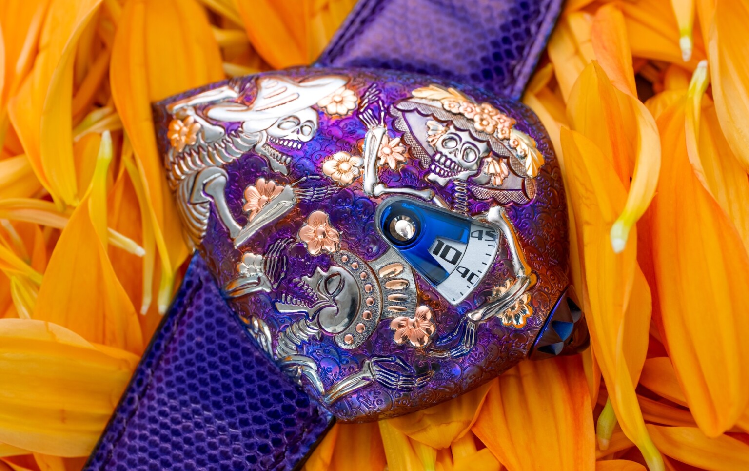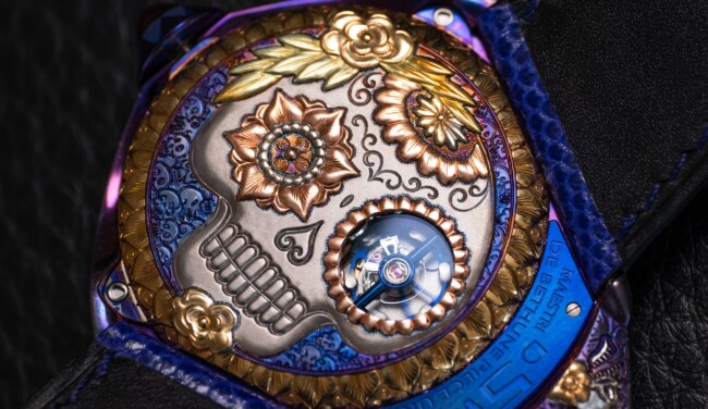 De Bethune presents: DW5 Cempasúchil A one-off creation for the Maestri’art Collection As every year in Mexico on the Day of the Dead, the Cempasúchil blossom sings the joy of an enduring celebration. This timekeeper is the outcome of a three-way dialogue: A conversation that spans two eras, between two exceptional art engravers. The first is José Guadalupe Posada, the legendary Mexican engraver and chisel virtuoso who made the dead dance at the end of the 19th century. His work is interpreted with the contemporary talent of Swiss Art engraver Michèle Rothen, working in close concert with Denis Flageollet, master watchmaker and founder of De Bethune. De Bethune celebrates Mexico! De Bethune celebrates the Day of the Dead! Between life and death, tequila shots and religious syncretism where practices and beliefs happily merge on a day that has become part of the Intangible Cultural Heritage of Humanity. Welcome to Mexico, where cemeteries are transformed into dance floors, tombs into tabletops, altars into sumptuous buffets, all blanketed with delicate blossoms of the Cempasúchil (the marigold also called La Flor de los Muertos – the flower of the dead) under the benevolent gaze of La Catrina. On November 1st and 2nd, the festival mobilizes the entire population. Families gather together, set up richly appointed altars for their dear departed, decorating them with offerings – sometimes modest, sometimes sumptuous, yet always from the heart in loving memory – and visit cemeteries to organize festive meals amidst the gravesites. Inscribed in 2008 on the UNESCO’s Representative List of Intangible Cultural Heritage of Humanity, EL Día de los Muertos, the Day of the Dead is the highlight of the Latin American festivities, with rivers of orange petals from the bouquets of Cempasúchil blossoms that line alleys and bathe them in the intense scent of marigolds, guiding the spirits of the deceased on their journey home. A tribute to the towering work of Posada There have been and are many watches on the subject of skulls and the Day of the Dead, but none of them inspired by the engraving of Mexican artist José Guadalupe Posada. With the DW5 Cempasúchil, Denis Flageollet, master watchmaker and founder of De Bethune, establishes a dialogue between his friend, kindred spirit and longtime collaborator, the talented Swiss Art engraver Michèle Rothen, and the renowned Mexican engraver of the last century. Posada (1852-1913). Engraving genius. His drawings have conquered eternity. Though he passed away in general indifference, he has since never ceased to be rediscovered beyond Mexico, where his work has become part of the national heritage, especially since the centenary of his death in 2013. The engraver of calaveras (‘skulls’ in Spanish) offers images of skeletons more alive than the living. Blessed with movement, Posada’s droll and picaresque ossuary abolishes the frontier between life and death. Never before has the representation of death been so playful and joyous. The chisel virtuoso has turned the macabre upside down, merging it with the singular way Mexicans celebrate their dead with happiness and joy. At the heart of his creations, the queens of the festival, the calaveras, are everywhere. Smiling skulls, hilarious skeletons coquettishly prancing about in top hats and boaters, Posada’s distinctive eye and hand capture an imagery that overflows with life. With more than 15,000 catalogued engravings, his legacy remains immense. A watch that speaks of joy, as much as it does of precision and complications Under the pencil stroke of Denis Flageollet and Michèle Rothen, the case of the DW5 Cempasúchil provides a unique spectacle. Where Posada etched his calaveras on flat zinc plates, Denis Flageollet and Michèle Rothen miniaturize them to the extreme, only to give them more relief and volume. On the outside of the timepiece, the watchmaker gives us the phantasmagorical world inspired by the discovery, on a trip across the Atlantic, of an old engraving that depicted a joyful rendering by Posada. On the inside, the real world of watchmaking precision and engineering. The watch bears witness to a vision of unbridled elation as that expressed by and on the EL Día de los Muertos, yet founded on a deep understanding and respect of the great watchmaking masters of the past, which it transcends and sublimates. Through this unique creation, as a bridge between the worlds of art and watchmaking, De Bethune sets a marker between the realms of life and death. The DW5 Cempasúchil transforms know-how into emotion and technique into pure beauty. For De Bethune, the approach applies just as well to art as it does to watchmaking. The DW5 Cempasúchil belongs to both worlds. It speaks of joy as genuinely as it does of precision and complications. The alliance of blued titanium and gold A new technology for combining the two metals Reaching beyond the challenge of a contemporary reinterpretation of the Mexican artist’s engravings, Denis Flageollet and Michèle Rothen introduce the additional technical challenges of not only working with a titanium case, but also of having it flame-blued, hand-engraved, and decorated for the first time with delicate gold inserts, as well as engraved to magnify the Cempasúchil blossoms. And to take the level of difficulty a few notches higher still, several different types of 18K gold alloy are used. The colors of metals… one of Denis Flageollet’s favorite playgrounds. It quickly became clear to him that the subject at hand, a watch for the Day of the Dead, required a different approach, a playing on nuances to accentuate the edginess of the famous portrait of La Catrina by Posada. White gold, yellow gold, rose gold, green gold (an 18K gold combined with a smidgeon of silver), and a new ‘marbled’ gold (a blend of white gold, rose gold and yellow gold): Denis Flageollet’s unrivalled know-how is given free rein at De Bethune’s own foundry in